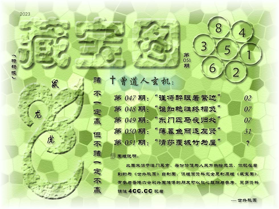 051期藏寶圖 新:清莎覆城竹为屋 老:又是今年忆去年 禁:蛇 禁:7尾 玄機字:《蠖》