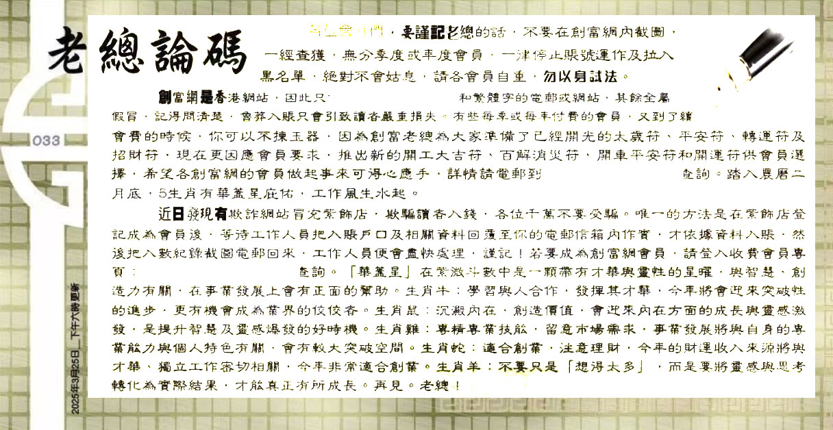 033期:六合皇金句/老总论码/萧公子/林大师/五行夺码/老 ...