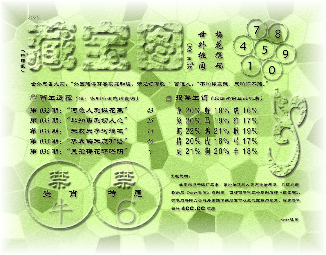 036期藏寶圖 新:闻道长安灯夜好 老:且插梅花醉洛阳 禁:牛 禁:6尾 玄機字:《倥》